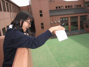 その後、掛け声とともに3階の非常階段から中庭に向けて順番に投下!