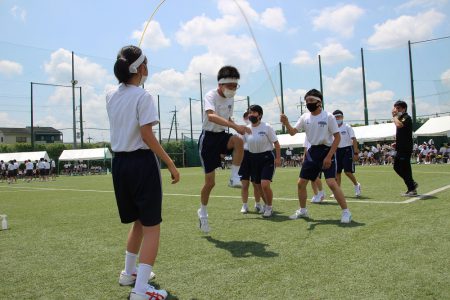 6月23日(水)、天候に恵まれ体育大会が開催されました。大縄跳びでは高校生よりも数多く飛ぶことができたので、黄団と青団が決勝戦に進出しました。団対抗リレーではどの団も強者揃いでしたが青団が1位を勝ち取ることができました。各団、出場した種目だけでなく応援にも力が入っていました。また3年生と2年生が協力して作成した団旗は、どの団も工夫を凝らした素晴らしい仕上がりで、体育大会の準備や予行などを通して一層絆が強くなったようでした。
