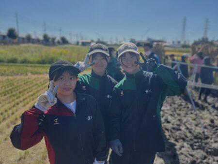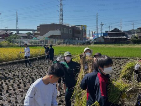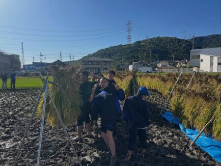 稲刈りと稲架(はさ)掛けチームに分かれ、協力しながら田んぼ一面の収穫が無事終わりました!1年生は先輩達に教えてもらいながら、初めは慣れない作業に苦戦していましたが、午後からはもう一人前です💪生徒たちは収穫したお米を食べるのが楽しみと言っていました🤤