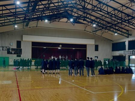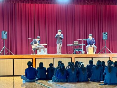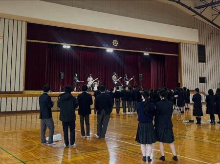 ・16日(金)の昼休みに体育館で軽音楽同好会のライブが行われました🎸ドラムやベース、ギターなどの音とともに素敵な歌声が-2-450x337.jpg)